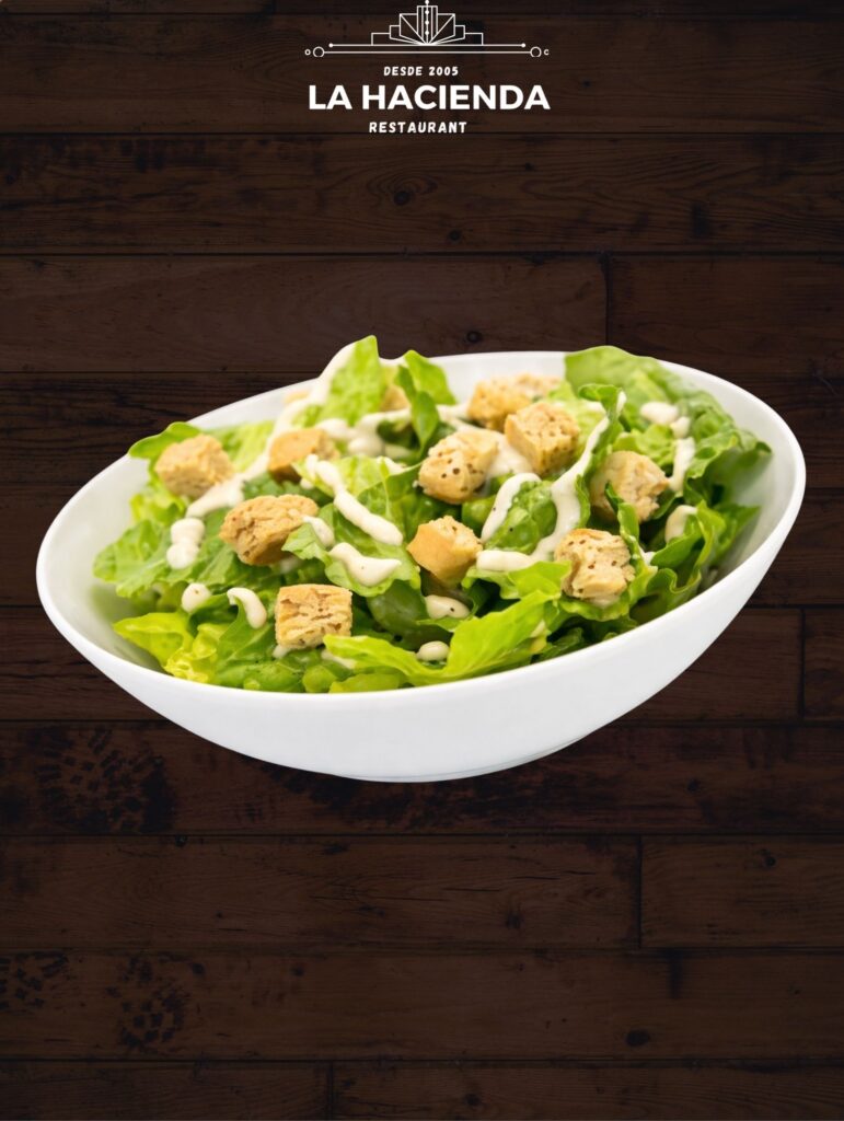 Lechuga romana, aderezadas con salsa césar, queso parmesano y crotones dorados.