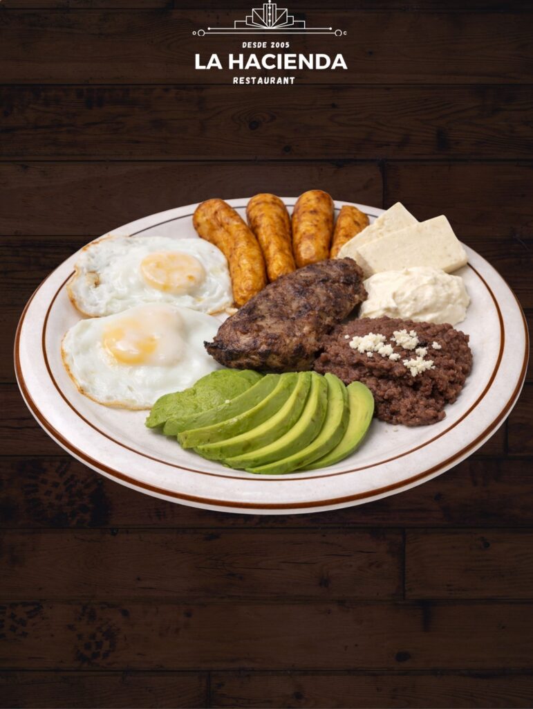 BEEF WITH PLANTAINS – TENDER BEEF SERVED WITH SWEET PLANTAINS, BEANS, CREAM, AVOCADO, AND SALVADORAN CHEESE.