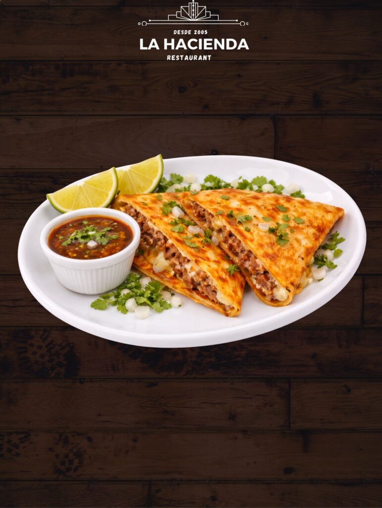“GOLDEN CORN, FLOUR, OR WHOLE WHEAT TORTILLA FILLED WITH JUICY BEEF BIRRIA, MELTED CHEESE, AND A TOUCH OF CILANTRO AND ONIONS. SERVED WITH HOT CONSOMMÉ FOR DIPPING AND SAVORING EVERY BITE.”