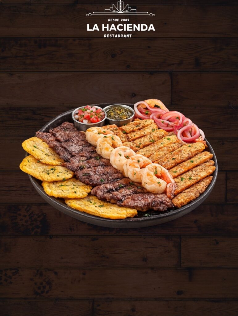 Entraña, pollo a la parrilla y camarones – un delicioso trío de suave entraña, jugoso pollo a la parrilla y camarones, acompañado de crujientes tostones.