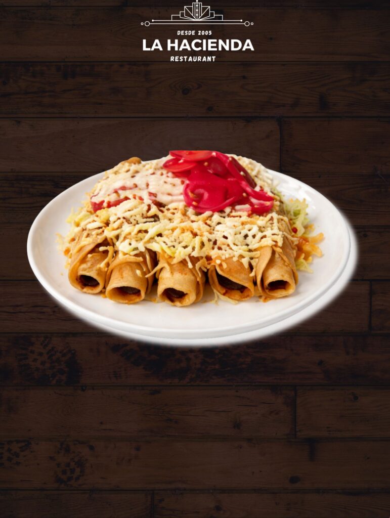 CRISPY ROLLED CORN TORTILLA STUFFED WITH CHICKEN, TOPPED WITH QUESO FRESCO, HOME MAKE HONDURAS TAMPIQUEÑA SAUCE.