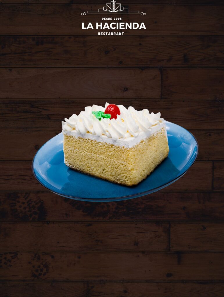 Pastel de tres leches – bizcocho esponjoso impregnado en una mezcla de tres leches, cubierto con crema suave y un toque de canela.
